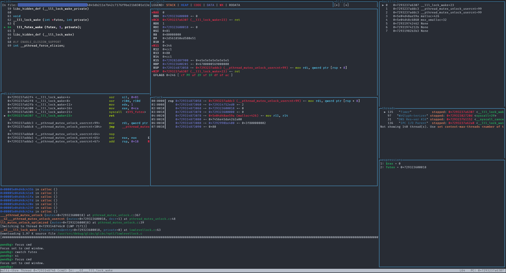 A useful summary of the current execution context is printed every time the debugger stops (e.g. breakpoint or single-step), displaying all registers, the stack, call frames, disassembly, and additionally recursively dereferencing all pointers. All memory addresses are color-coded to the type of memory they represent.