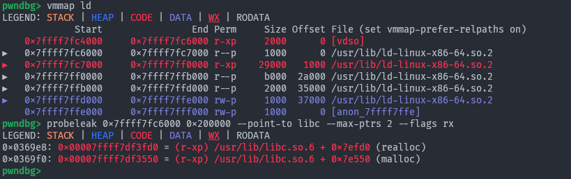Pwndbg enhances the standard memory map listing and allows easy searching with vmmap.