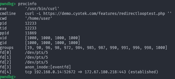 Use the procinfo command in order to inspect the current process state, like UID, GID, Groups, SELinux context, and open file descriptors! Pwndbg works particularly well with remote GDB debugging like with Android phones.