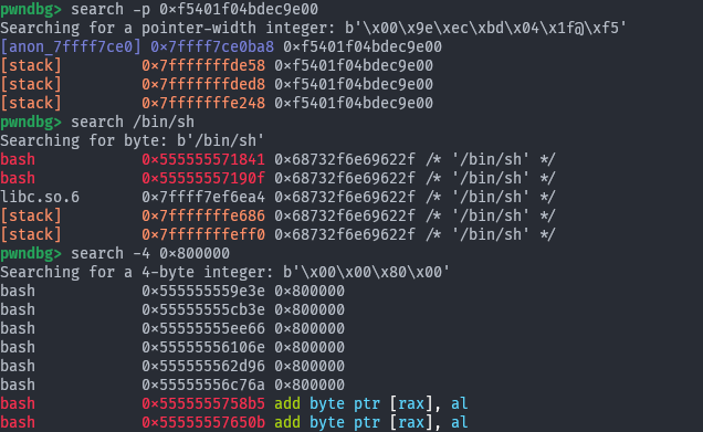 Pwndbg makes searching the target memory space easy, with a complete and easy-to-use interface. Whether you're searching for bytes, strings, or various sizes of integer values or pointers, it's a simple command away.