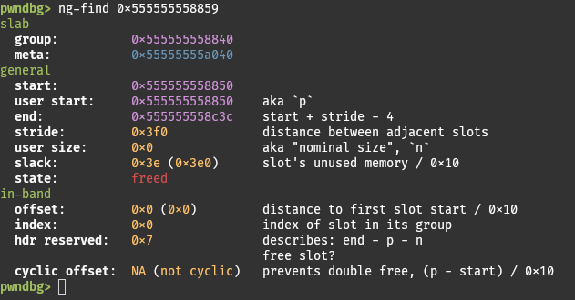 Next, it is crucial to have a command which takes an address and tells the user everything it can figure out about that address. For glibc this is hi (heap inspect), for mallocng this is ng-find, for SLUB this is slab contains. For future consistency, call this command "find". The command must work even if the address if in the middle of the heap object. Here is what ng-find looks like: