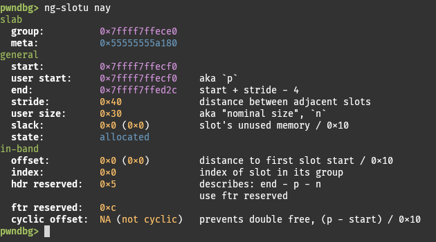 These comments on the right might seem redundant, but they can be really useful for people to refresh their knowledge on the allocator. Don't be afraid to introduce new terminology, as long as it is explained properly in the "explain" command. The mallocng printing code leverages pwndbg/lib/pretty_print.py:from_properties() for object visualization which you are encouraged to use (but if you want to do something else, don't be afraid to).