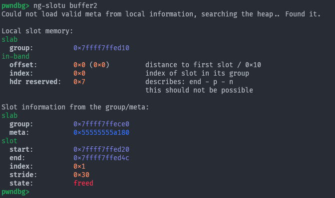 An important thing to keep in mind here is that the "local view" of the metadata around the given address may not be the same as what the allocator actually sees. But, both can be valuable. You should thus make sure to print both if they differ, and make it clear to the user what is what. Carefully study pwndbg/commands/mallocng.py:smart_dump_slot() to understand what I mean. Here are two important examples: