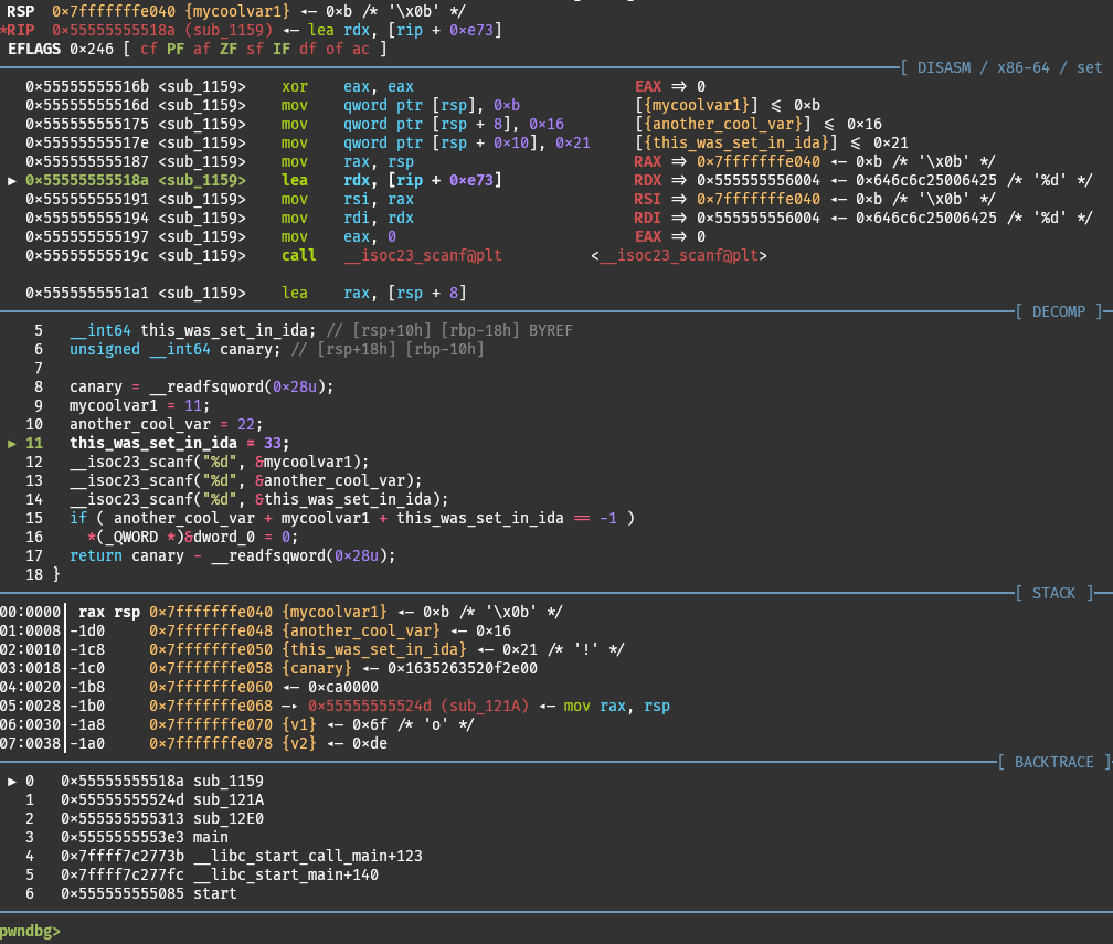 We implement integration via decomp2dbg (<3) decompiler plugins. All decompiler-side logic is done via decomp2dbg, and all debugger-side logic is handled by Pwndbg.